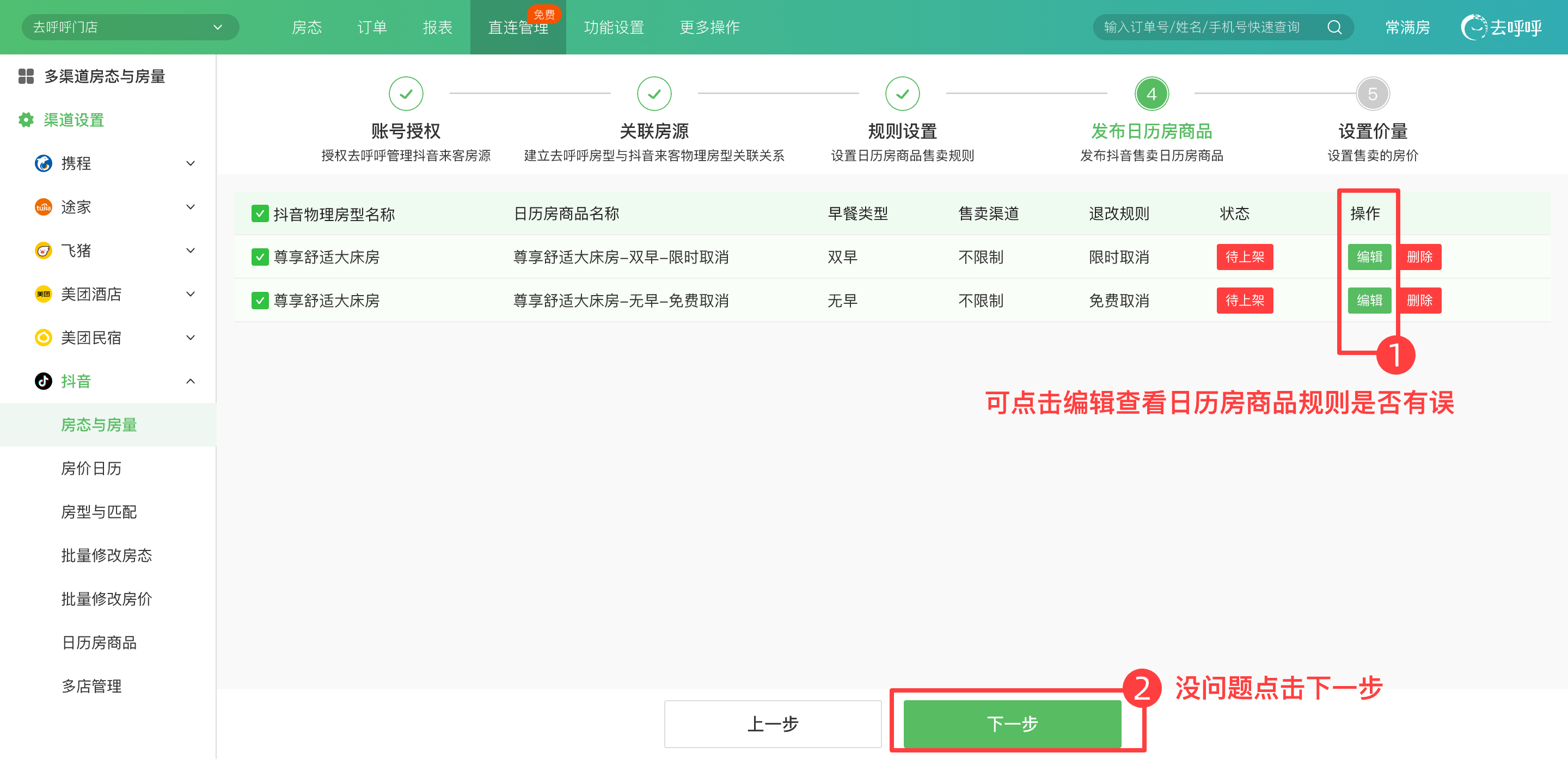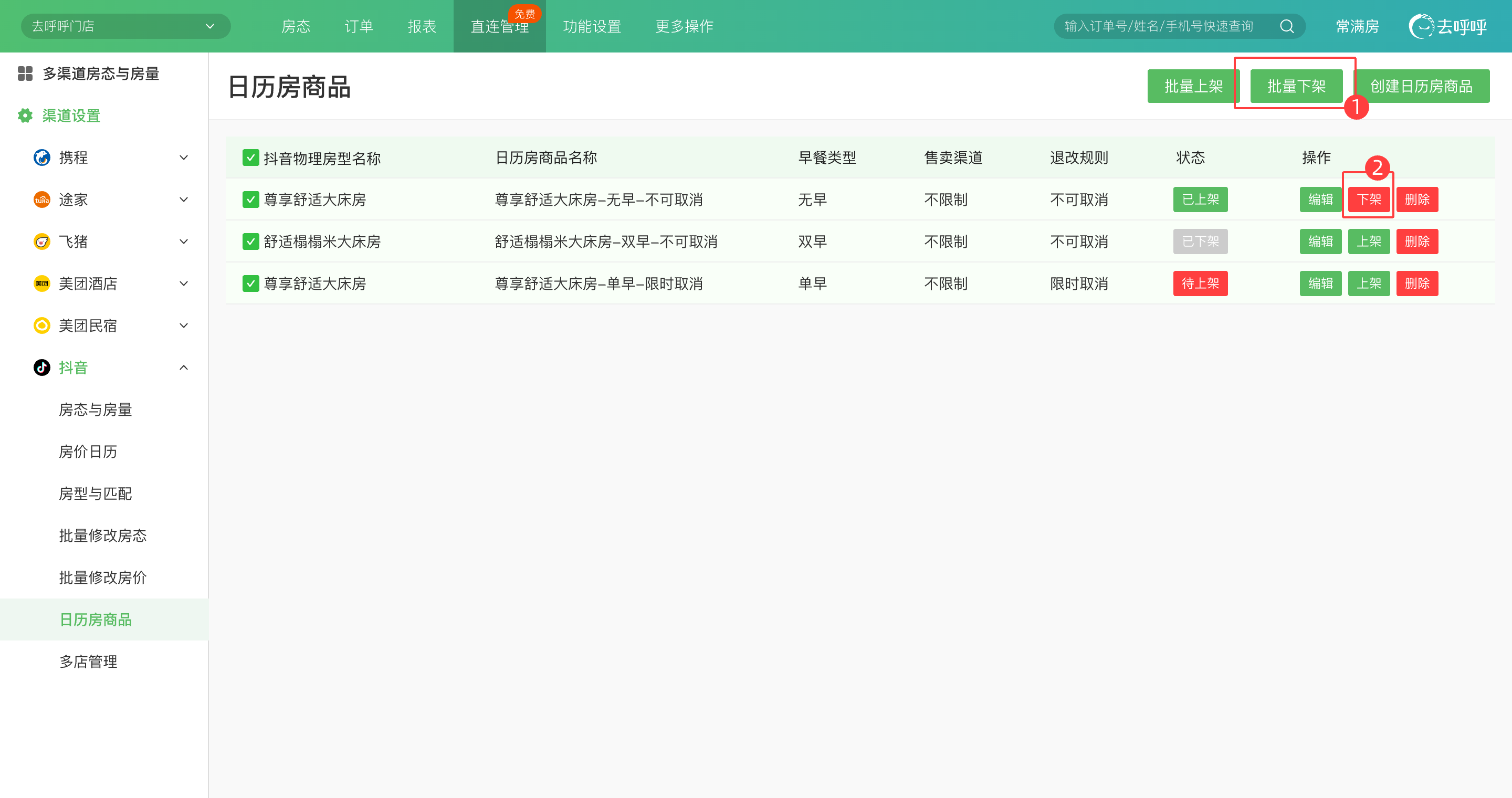 ④ 根据抖音规则,直连前,上架的日历房商品须做下架操作,未下架日历房商品的抖音来客订单将不会自动落单到去呼呼PMS。【重要提示】请下架没有直连标识的日历房商品。