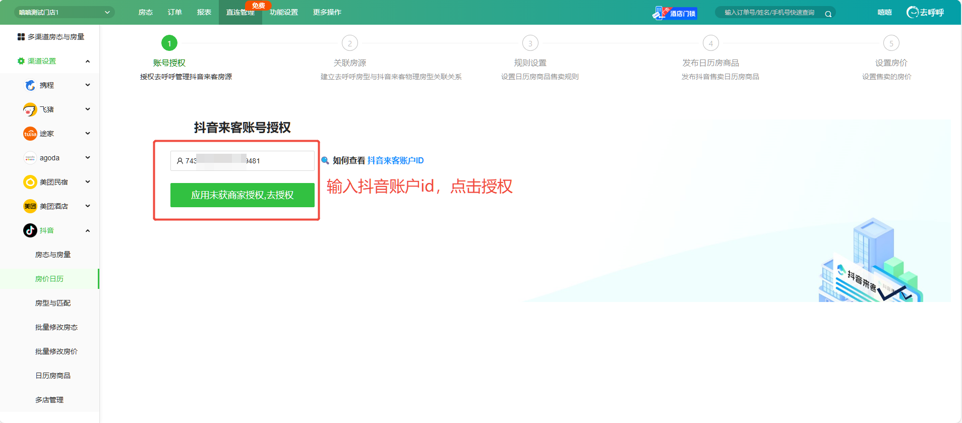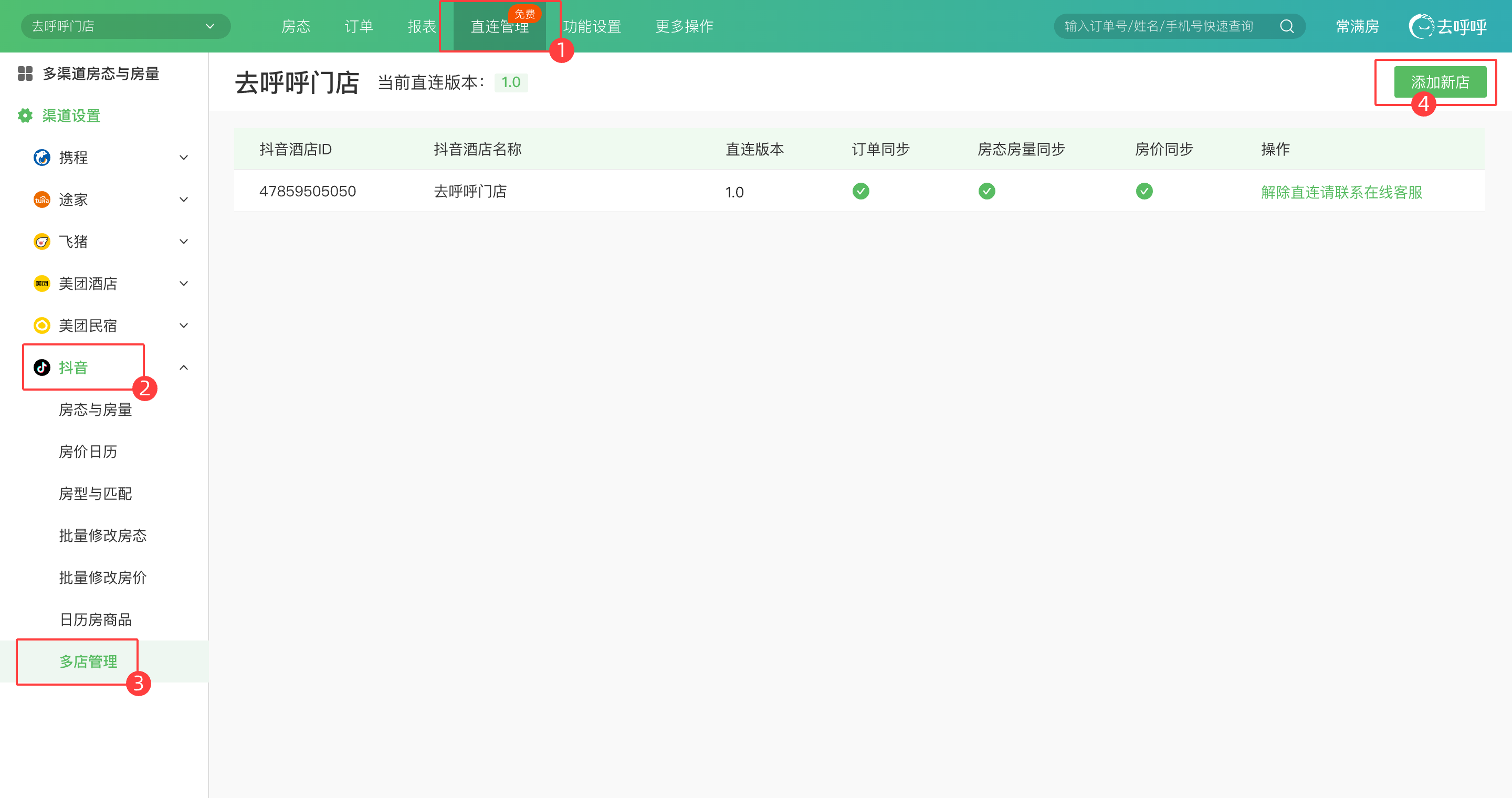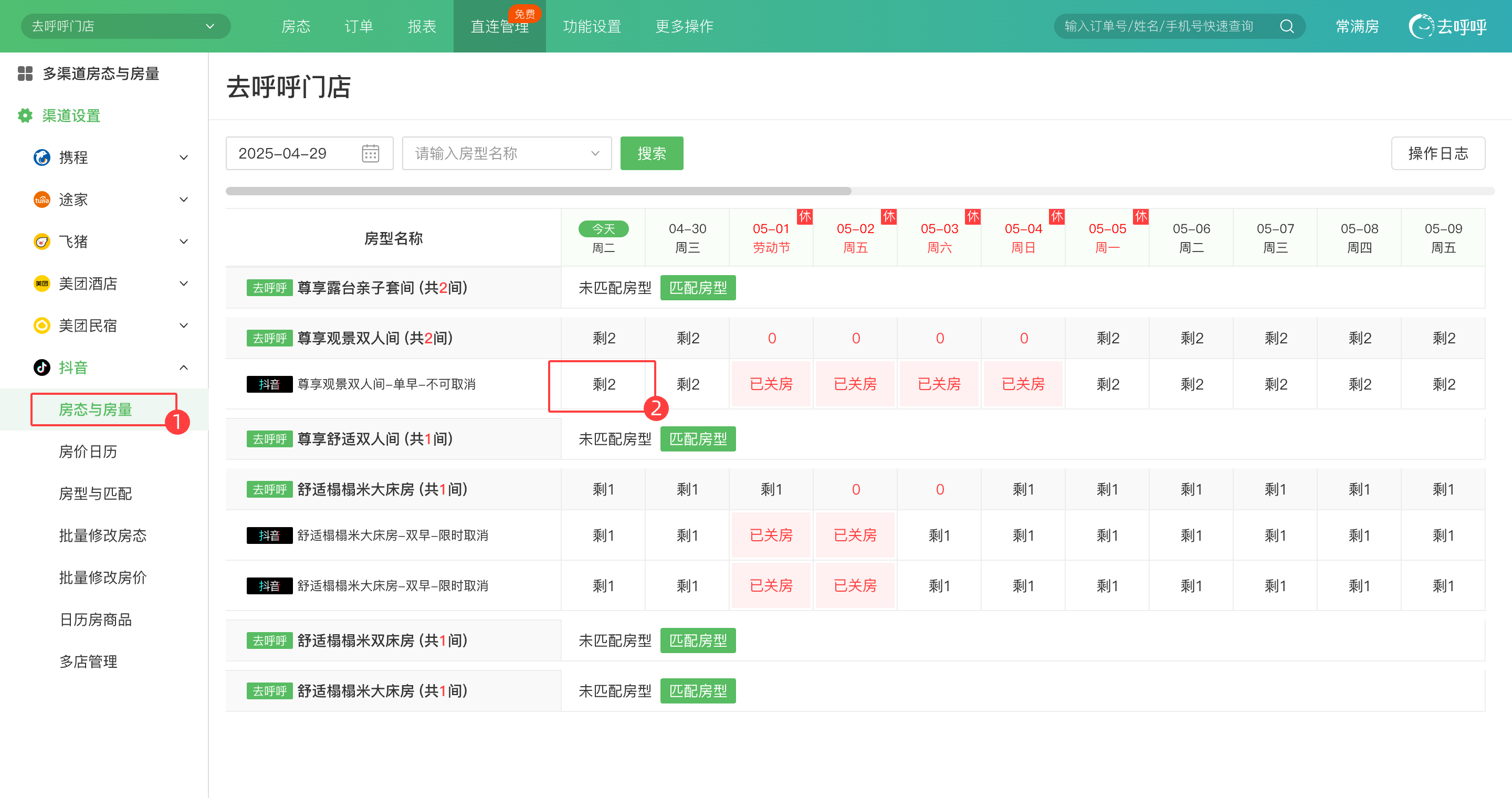 温馨提示:直连后抖音来客的房态、房量、房价只能通过去呼呼PMS维护。