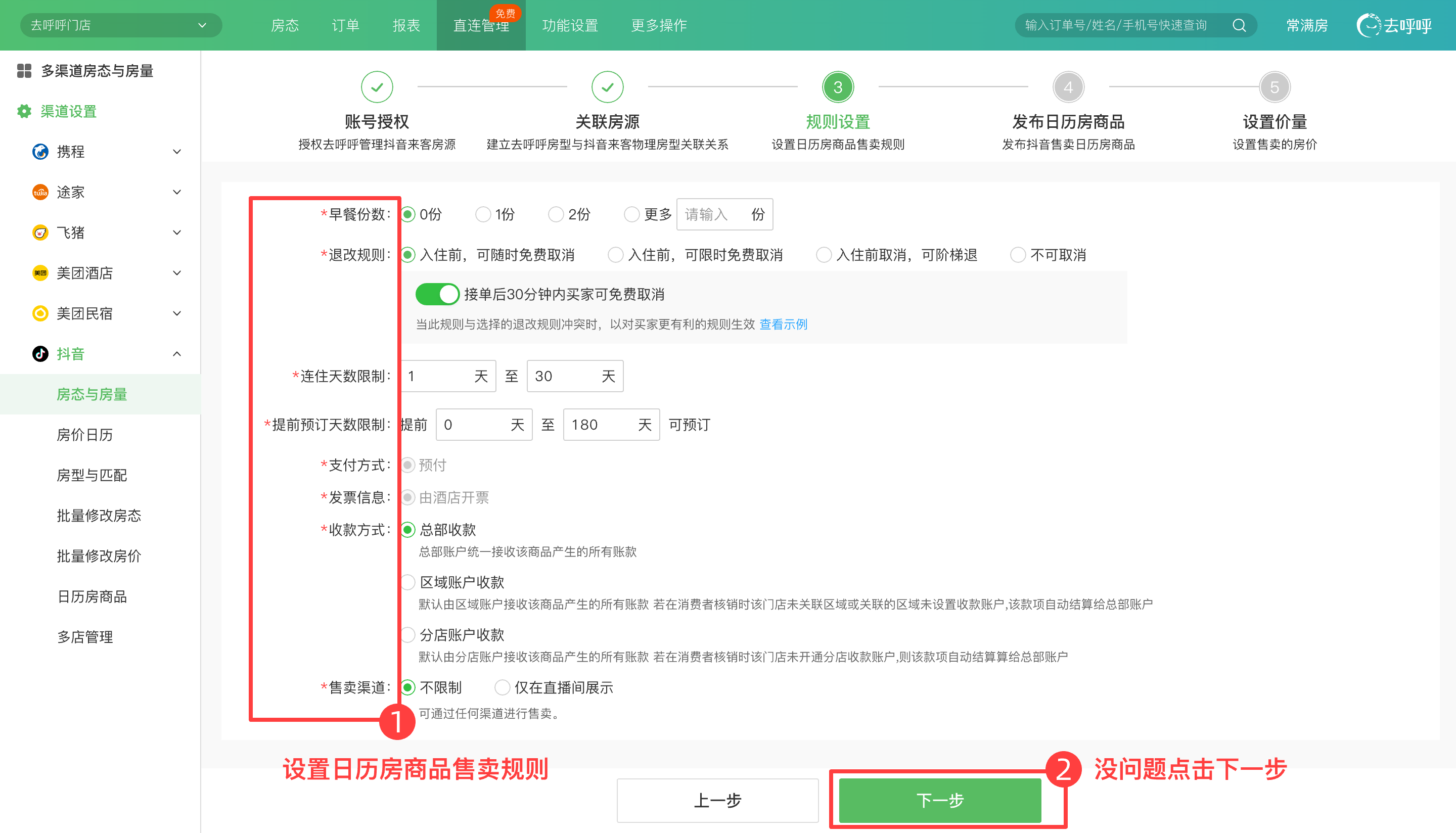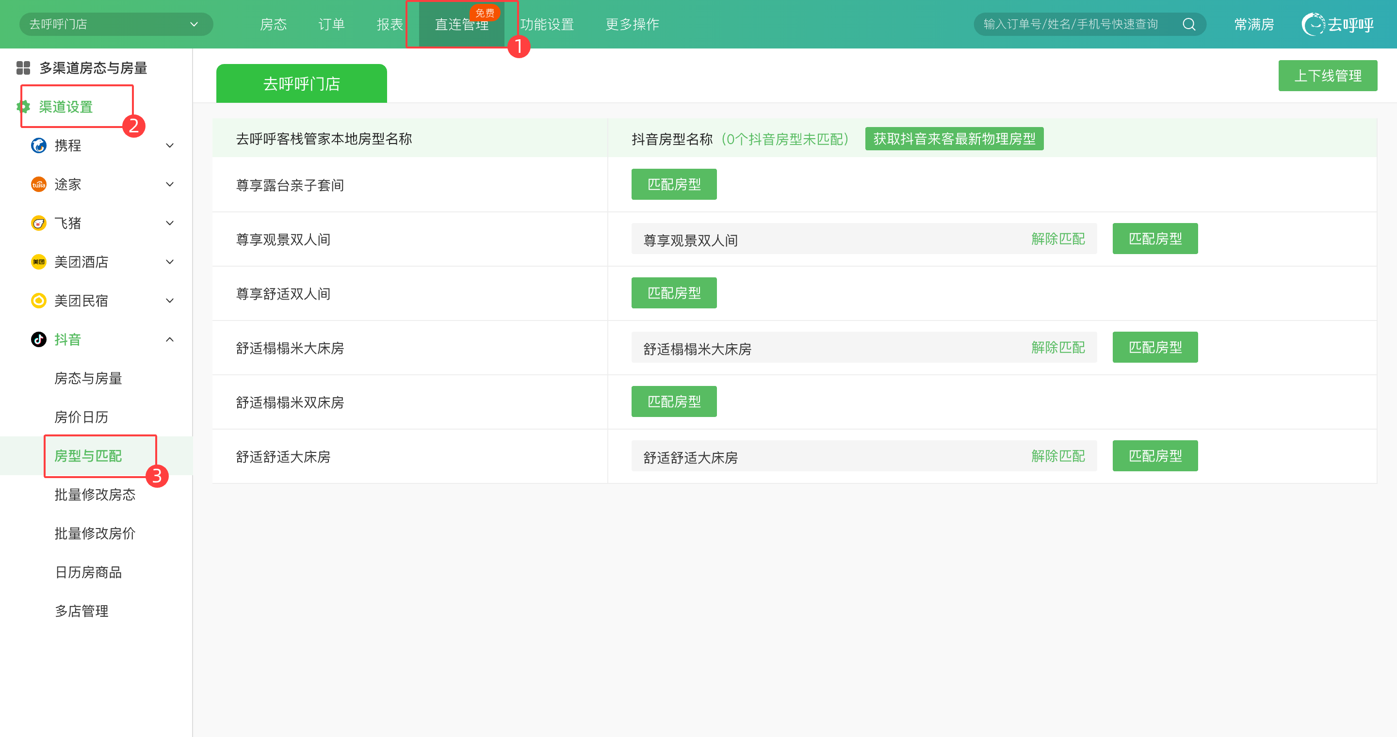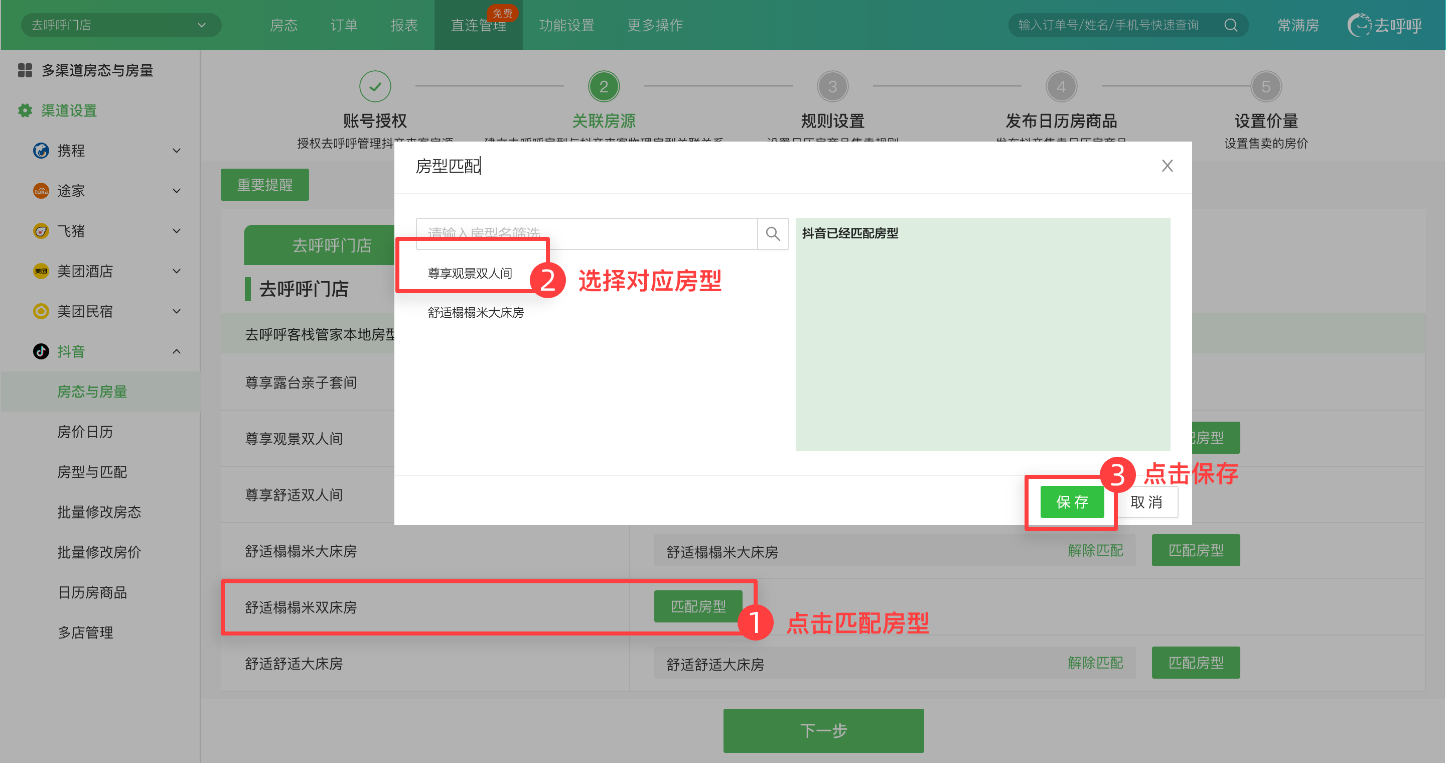4.1 路径:【直连管理】-【渠道设置】-【抖音】-【房型与匹配】,需先把房型都匹配完善。