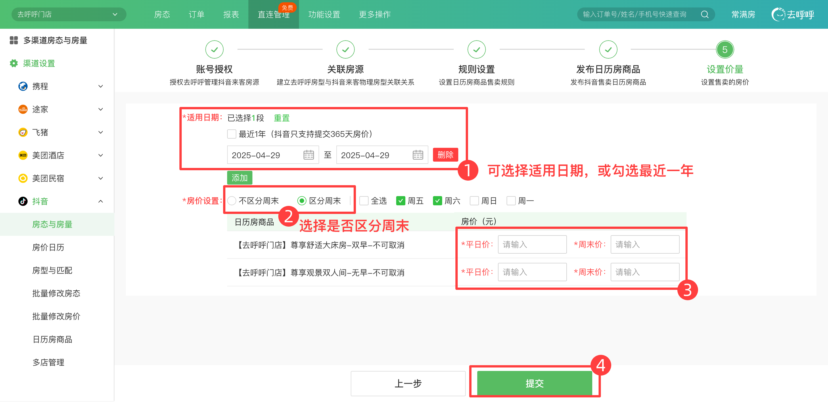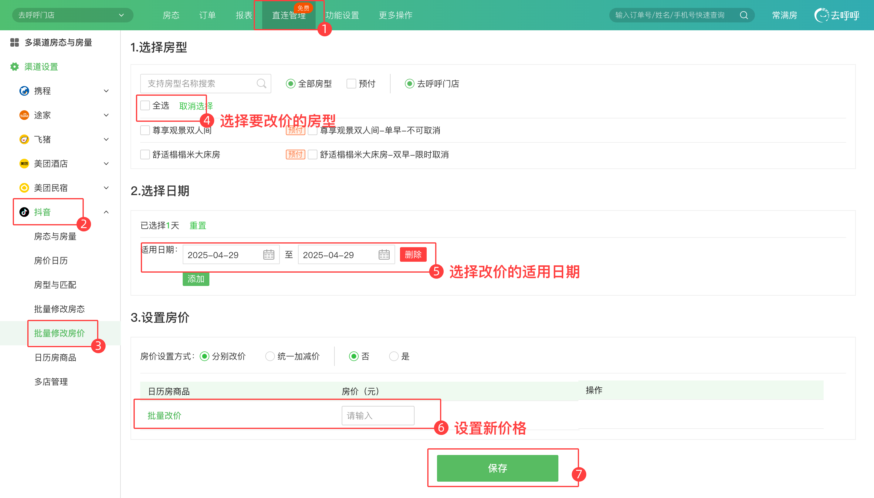 路径:点击导航栏【直连管理】-【渠道设置】-【抖音】-【批量修改房价】-选择要改价的房型,设置适用日期,操作修改房价。