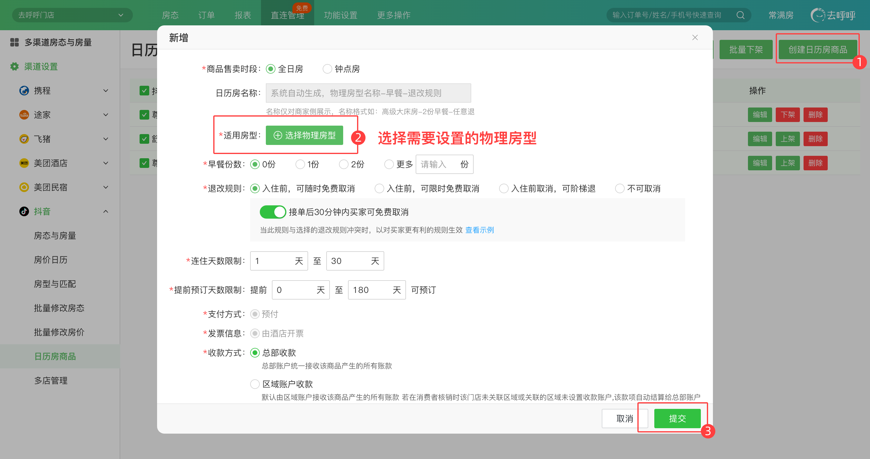 路径:【直连管理】-【渠道设置】-【抖音】-【日历房商品】-【创建日历房商品】