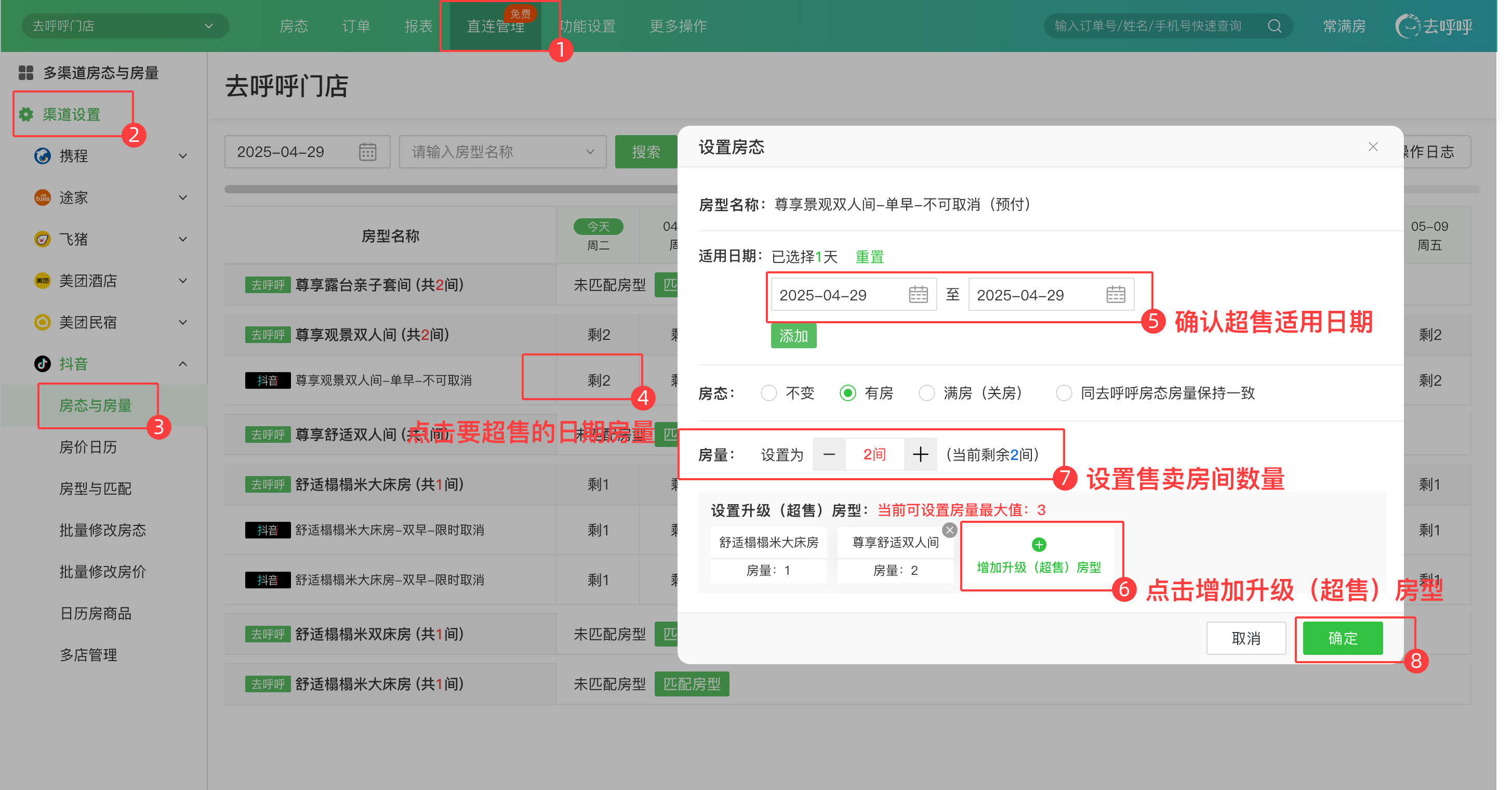 路径:点击导航栏【直连管理】-【渠道设置】-【抖音】-【房态与房量】,点击需要开启超售的剩余房量,选择日期,点击【增加升级/超售的房型】,再增加超售的房量,用其他房型的剩余房量补充该房型实现超售,同时避免超卖。