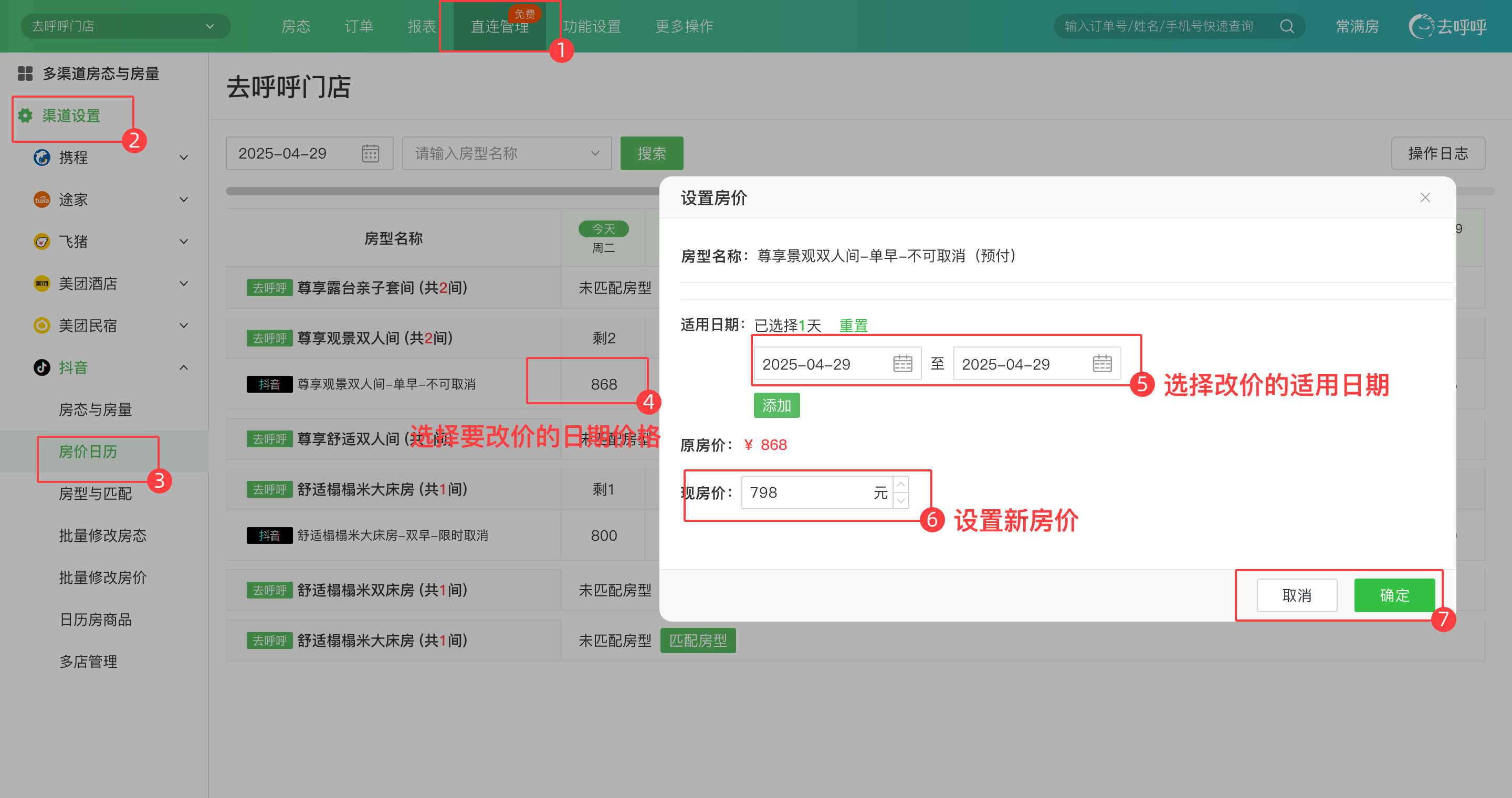 路径:点击导航栏【直连管理】-【渠道设置】-【抖音】-【房价日历】-点击要改价的日期价格,操作修改房价。