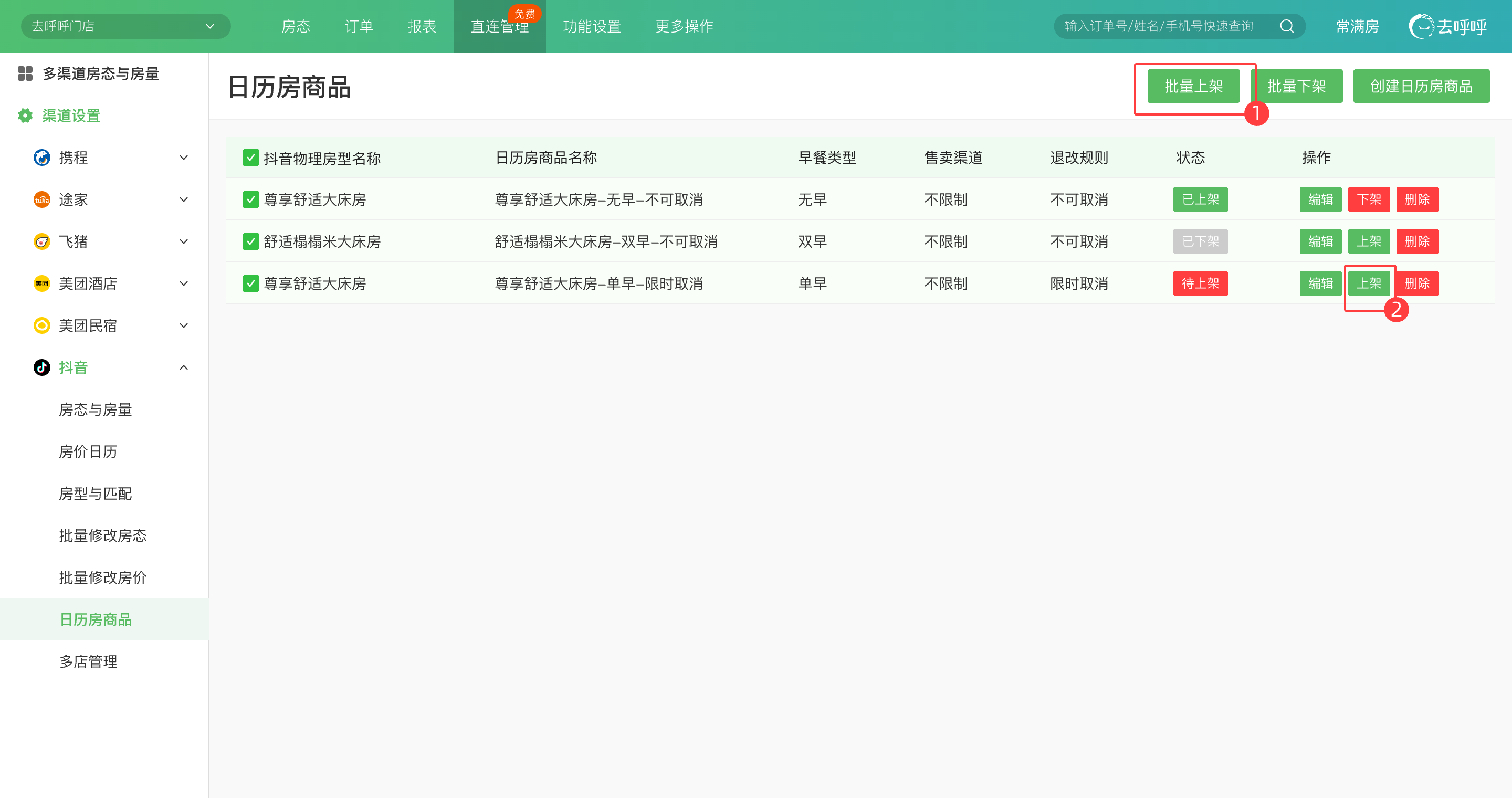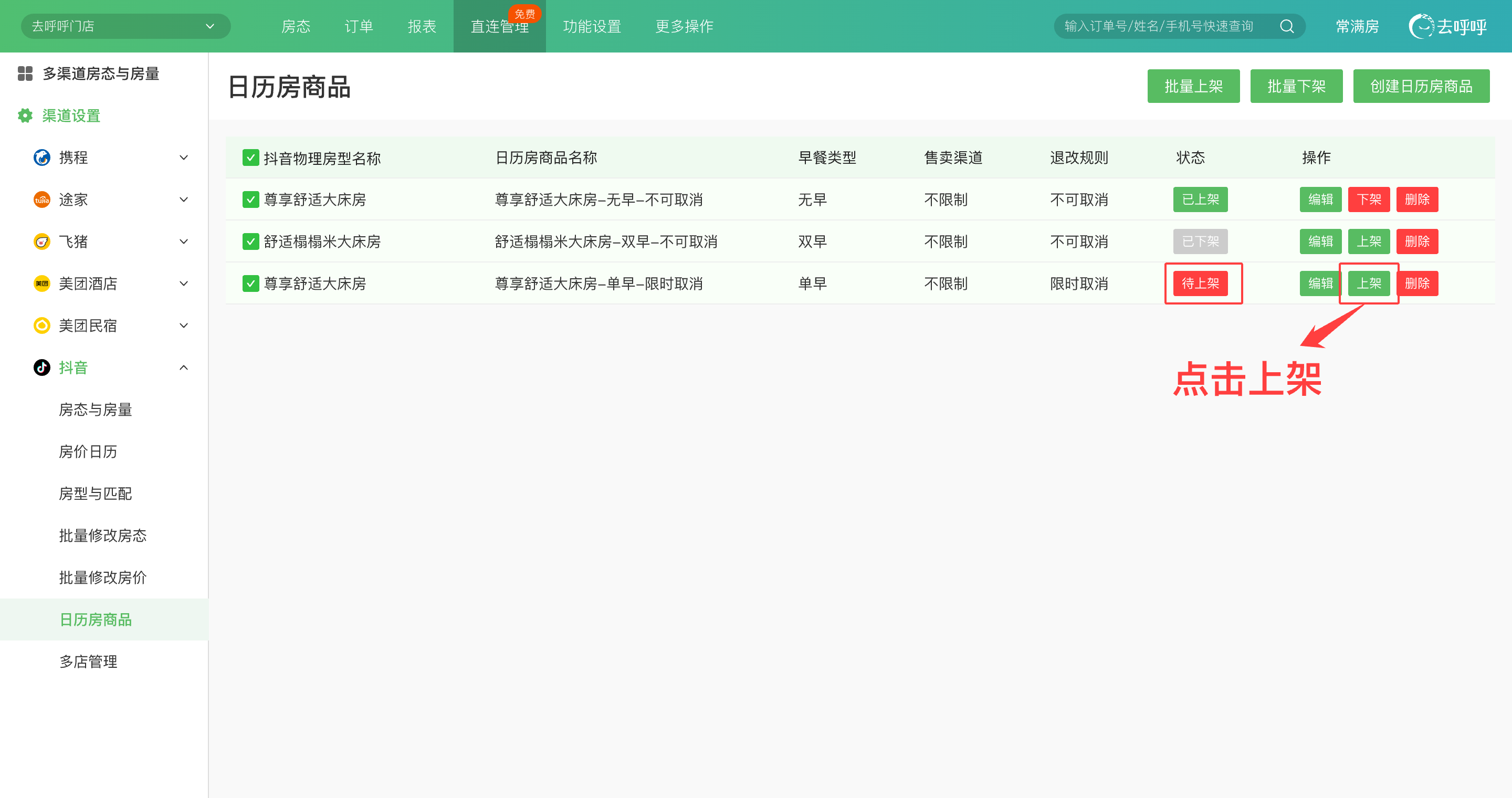 路径:【直连管理】-【渠道设置】-【抖音】-【日历房商品】-【上架/批量上架】