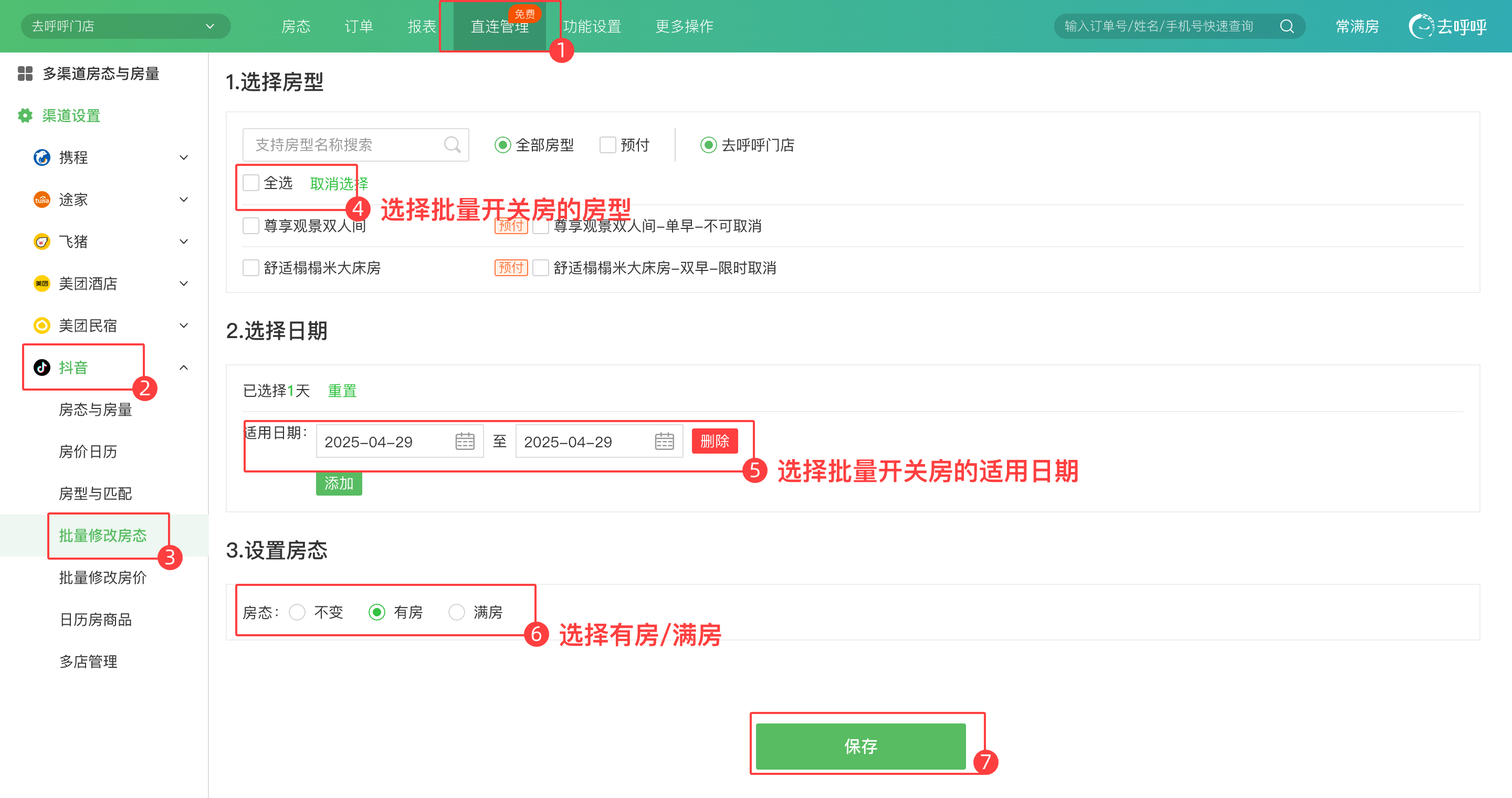 路径:点击导航栏【直连管理】-【渠道设置】-【抖音】-【批量修改房态】-选择需要批量操作的房型,选择时间,批量开关房