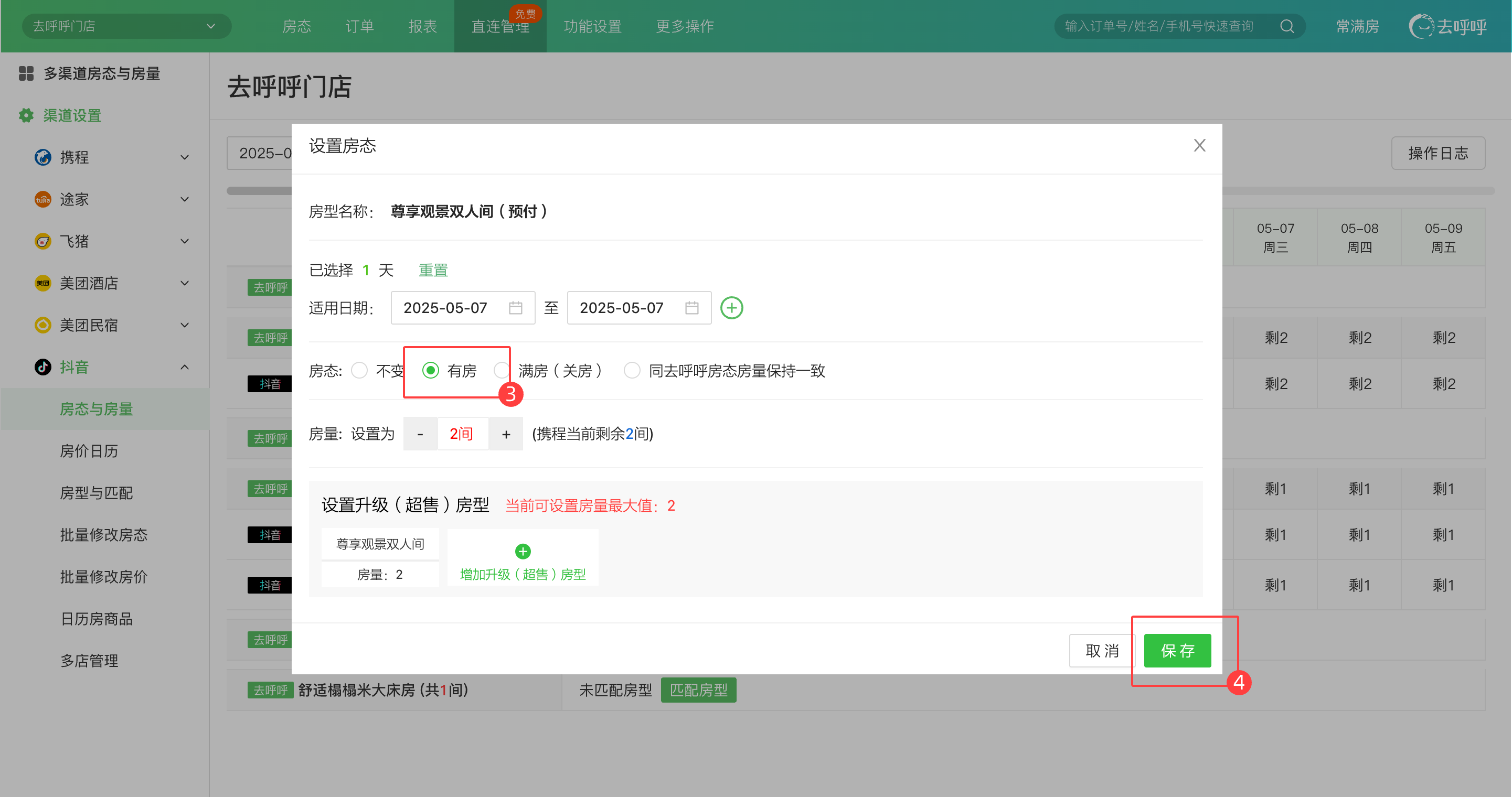 2、直连后抖音来客的房态、房量、房价只能通过去呼呼PMS维护。